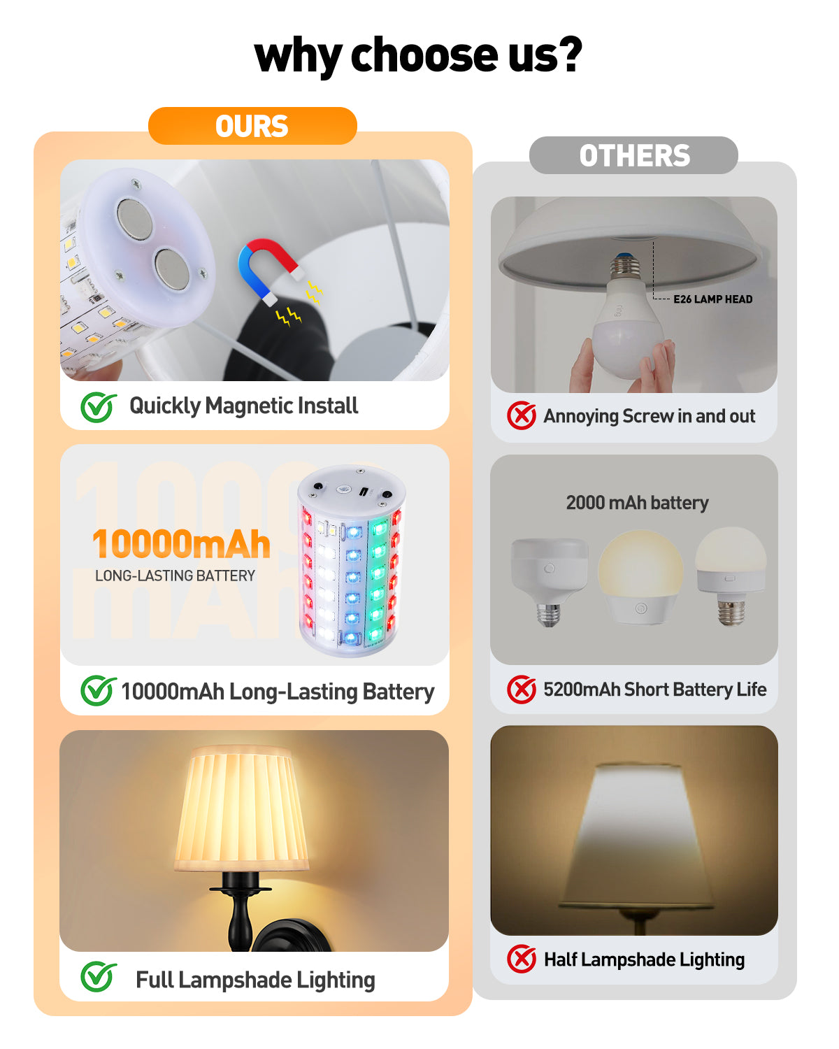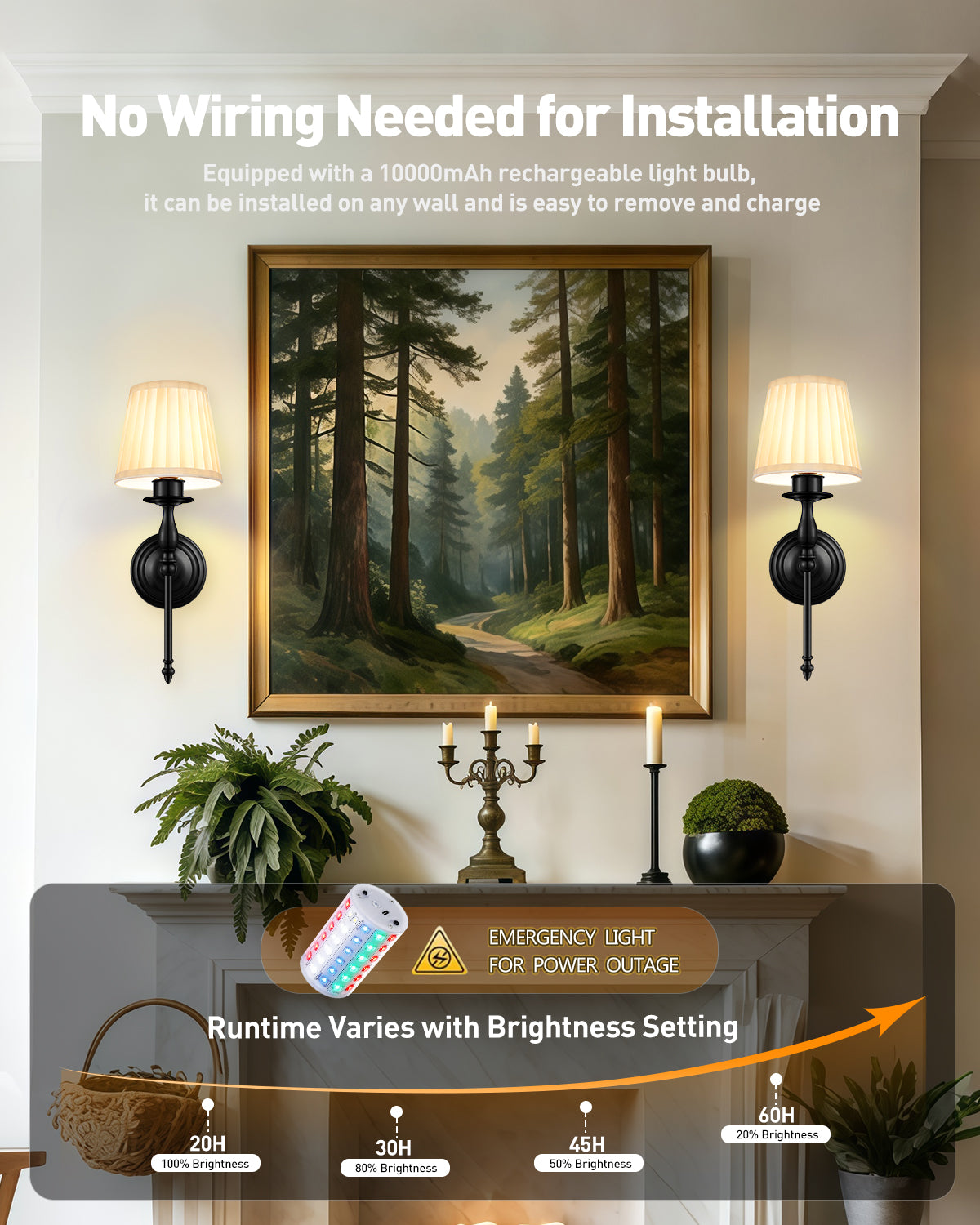 Renter Friendly Wall Sconce:NO Wiring Required! No Hardware! No Plug! No electrician is required! Our battery-powered wall sconce set of 2 is apartment-friendly and incredibly easy to install: Simply attach the wireless scones lighting on the wall with included wall mount brackets and effortlessly put the magnetic bulb onto the socket base.ideal for old houses, rentals or any dark corners that need lighting.