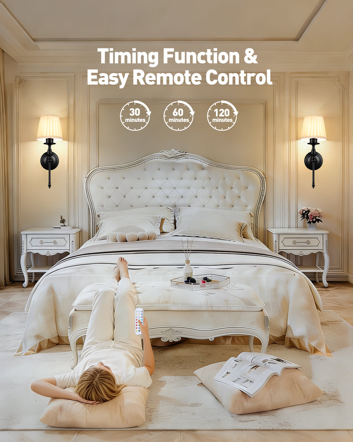 Smart Remote & Sleep Timer:Take full control of your lighting from anywhere in the room. With two included remotes offering 10-meter long-range control, you can easily adjust brightness, colors, and lighting modes right from your couch or bed—no need to get up. Whether you prefer to control each wall sconce individually or sync them together for a unified glow, flexibility is at your fingertips. Set the 3-stage sleep timer (30, 60, or 120 minutes) to let the light fade gently into darkness as you drift off. Your perfect atmosphere, mastered.